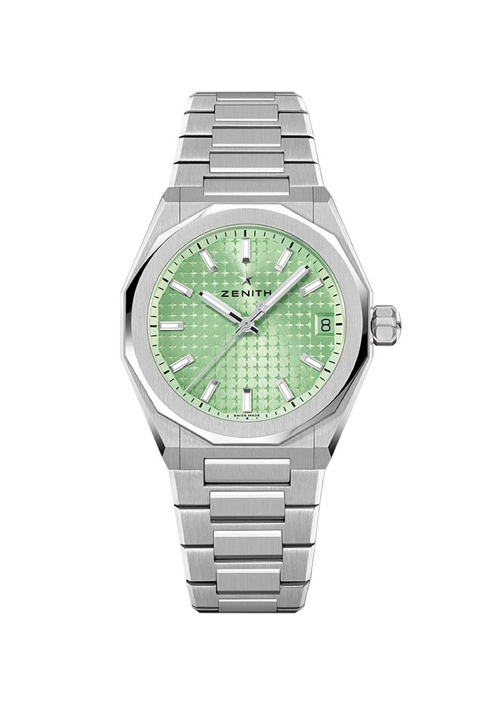 Die DEFY Skyline im achteckigen 36-mm-Edelstahlgehäuse mit facettierter Lünette und einem Zifferblatt mit Sonnenschliff in Hellgrün mit Soleil-Guillochierung, das den emblematischen vierzackigen Stern von ZENITH aufgreift. Angetrieben von dem automatischen Manufakturwerk Elite 670. Austauschbares Armband aus Edelstahl und Kautschukarmband mit rosa Muster. Es wird ein zweites Armband angeboten, um das Auswechselsystem der Uhr in vollem Umfang nutzen zu können.