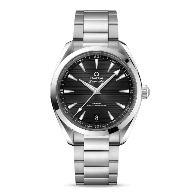 Die Seamaster Aqua Terra ist ein Tribut an OMEGAs großes maritimes Erbe. Das symmetrische Gehäuse dieses 41-mm-Modells besteht aus Edelstahl und ist auf der Rückseite mit einem Wellendekor versehen. Das schwarze Zifferblatt zeichnet sich durch ein horizontales „Teak“-Dekor aus, das sich an den hölzernen Deckplanken von Luxus-Segeljachten inspiriert. Das Zifferblatt verfügt außerdem über ein Datumsfenster bei 6 Uhr und die rhodinierten Zeiger und Indizes sind mit weißer Super-LumiNova gefüllt. Der Zeitmesser wird von einem polierten und gebürsteten Armband am Handgelenk gehalten und von dem OMEGA Master Chronometer Kaliber 8900 angetrieben, das vom Eidgenössischen Institut für Metrologie (METAS) zertifiziert wurde und höchsten Branchenstandards entspricht.