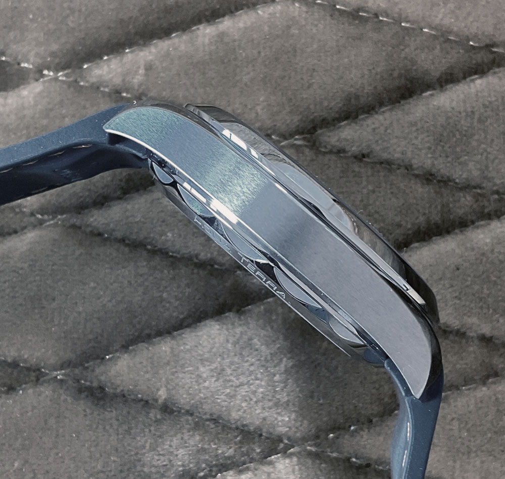 Blaues Zifferblatt mit horizontalem, linearem, strukturiertem Design.