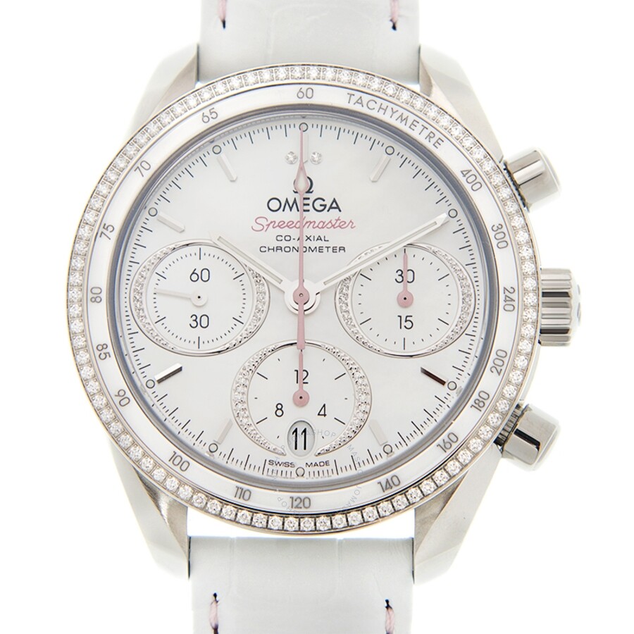 Edelstahlgehäuse mit einem weißen Lederband. Feste Edelstahl mit einem blauen Aluminium Top-Ring mit Diamanten besetzt und zeigt Tachymeter Markierungen Lünette. Weißes Zifferblatt mit Index-Stundenmarkierungen. Minutenmarkierungen um den äußeren Rand. Zifferblatt Typ: Analog. Lumineszierende Zeiger und Markierungen. Datumsanzeige bei der 6-Uhr-Position. Chronograph - drei Hilfszifferblätter zur Anzeige von: 60 Sekunden, 30 Minuten und 12 Stunden. Omega-Kaliber 3330 Automatikwerk, basierend auf dem ETA Valjoux 7753, mit 31 Juwelen, einer Gangreserve von ca. 52 Stunden und einer Frequenz von 28800 U/min. Kratzfestes Saphirglas. Zug-/Druck-Krone. Solider Gehäuseboden. Runde Gehäuseform. Gehäusegröße: 38 mm. Breite des Armbands: 18 mm. Faltschließe mit Druckknopfverschluss. Wasserdicht bis 100 Meter. Funktionen: Chronograph, Datum, Stunde, Minute, Sekunde, Koaxialhemmung, Chronometer. Omega Speedmaster Chronograph Automatik Chronometer Diamant weißes Zifferblatt Unisex Uhr 324.38.38.50.55.001