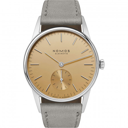 Orion unsere kleinere Variante, mit einem Durchmesser von knapp 33 Millimetern und hellem Velourslederarmband. Eine Schöne Uhr für die Zarte Handgelenke, mit derselben Technik, die Sie von anderen NOMOS-Uhren kennen. Hier arbeitet ein Handaufzugskaliber Alpha.