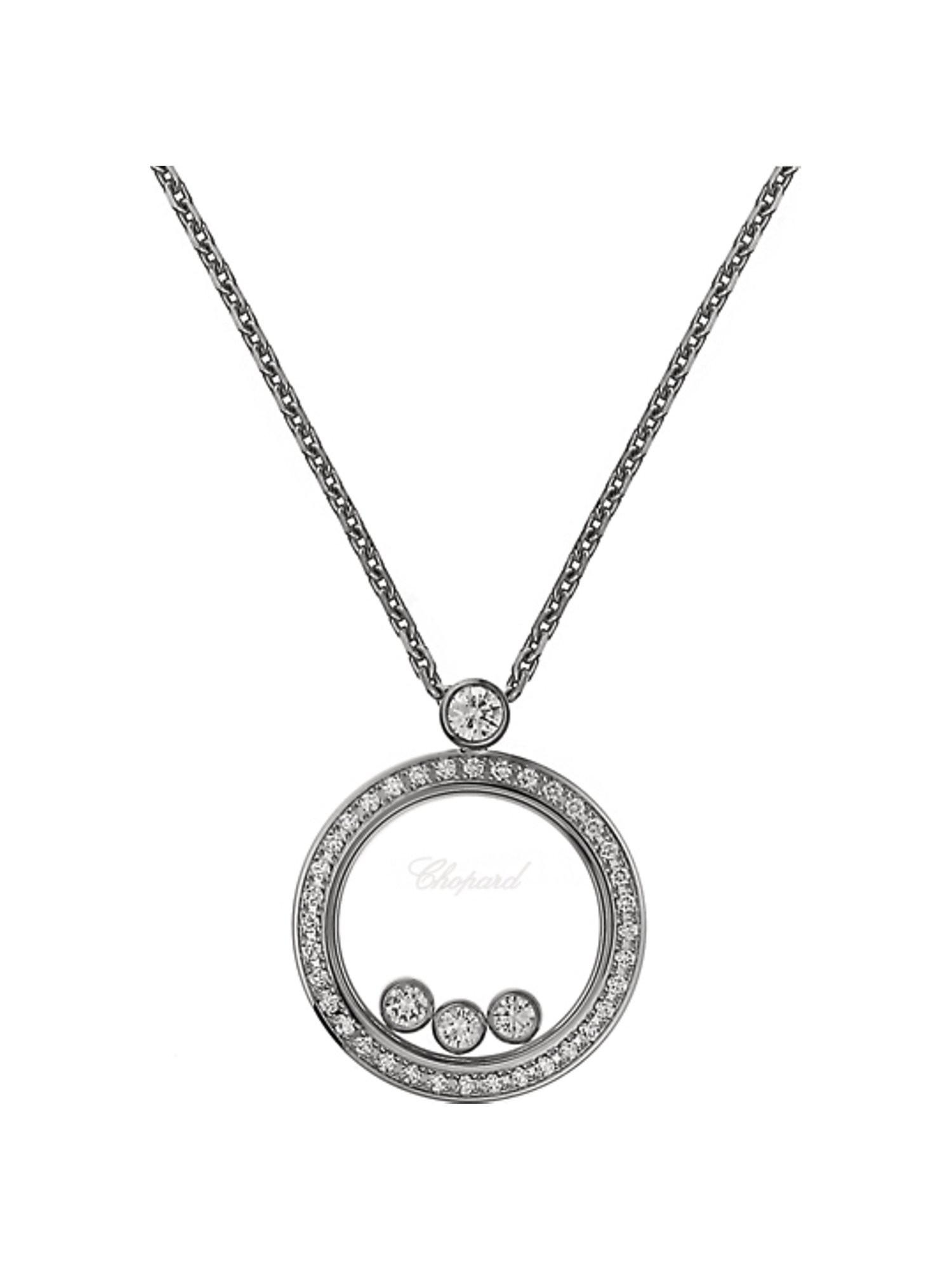 Der Anhänger: Innerhalb des Rahmens, eingebettet zwischen zwei Saphirgläsern, befinden sich drei einzelner, frei tanzende Brillanten. Dieser mobile Diamant bewegt sich ungehindert und verstärkt so sein Funkeln bei jeder Bewegung der Trägerin.