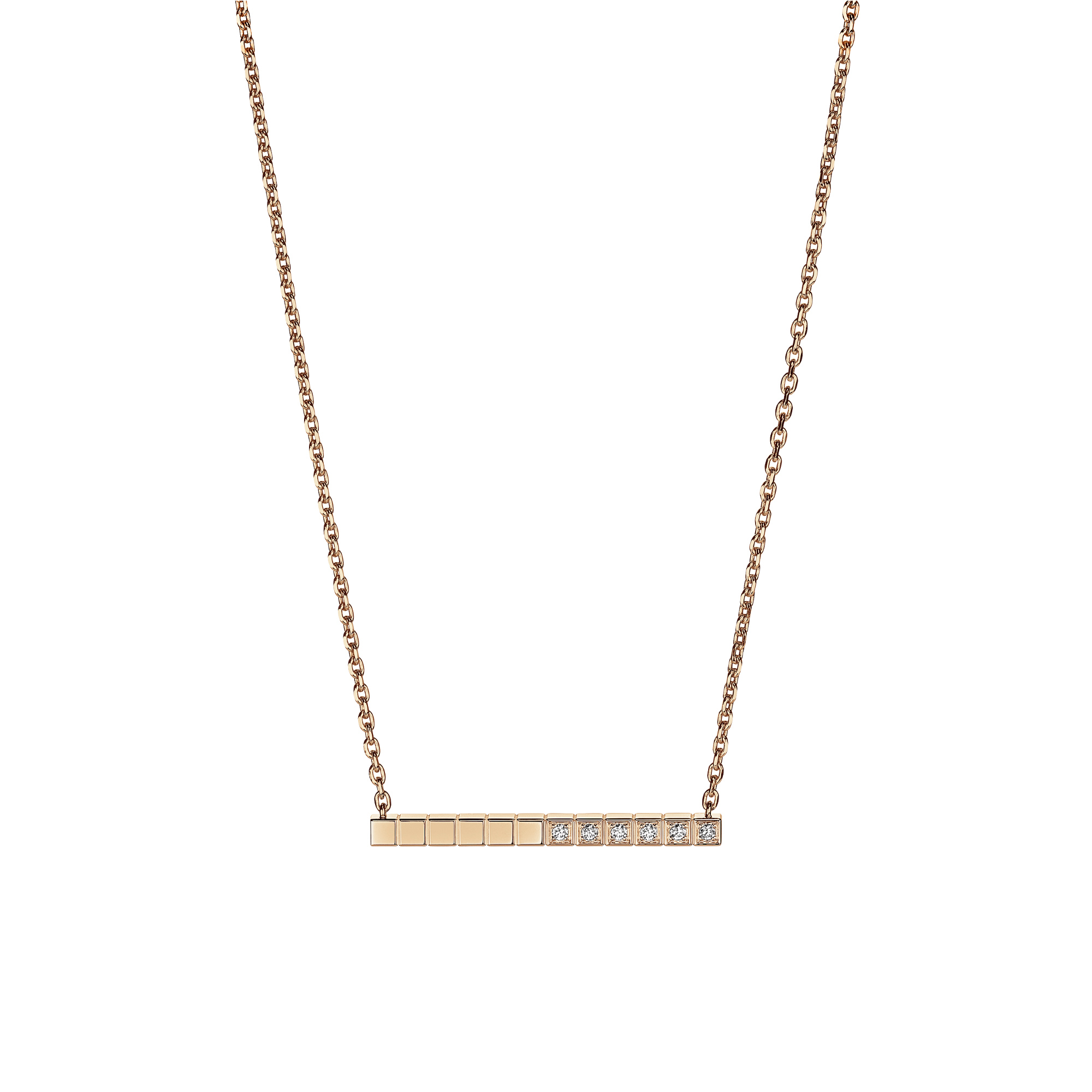 Die Chopard Ice Cube Pure Halskette mit Anhänger verkörpert schlichte Eleganz und ist ein wahrhaft luxuriöses Schmuckstück. Das exquisite Design dieser Halskette besteht aus 750 Roségold und ist mit 6 Diamanten (0,06 Karat) verziert. Sie ist ein zeitloses Accessoire für anspruchsvolle Damen, die feinste Qualität und erstklassige Handwerkskunst schätzen.