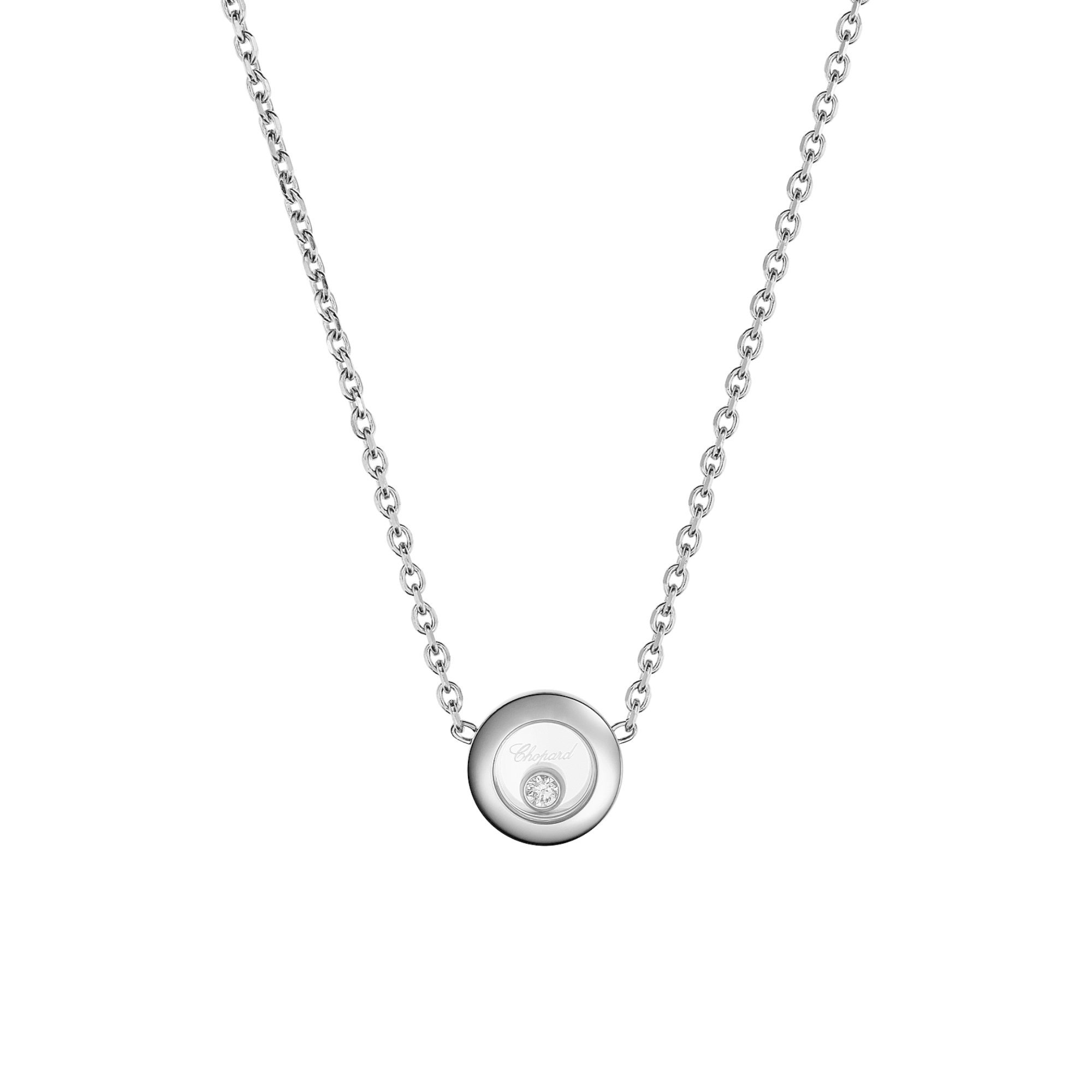 Die Linie Happy Diamonds Icons von Chopard repräsentiert diese Einzigartigkeit und die Eleganz des Stils in vollem Umfang. Die aus 18K Weißgold gefertigten Schmuckstücke vereinen raffinierten Stil und schmucktechnische Perfektion. Dieser Anhänger hängt an einer 45 cm langen Halskette und hält zart einen sich sanft bewegende Diamanten, dem Markenzeichen der Marke. Das im Licht tanzenden Edelstein stellt das innere Schimmern jeder Dame dar.