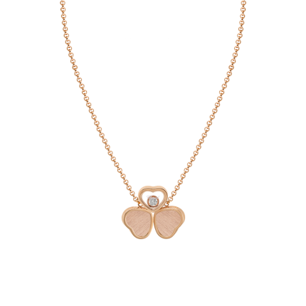 Die Chopard Happy Hearts Wings Halskette mit Anhänger (Referenznummer: 81A083-5711) ist ein elegantes Schmuckstück aus 18-karätigem Roségold, verziert mit einem Diamanten im Brillantschliff und 44 weiteren Diamanten. Hier sind einige Details über diese Halskette: