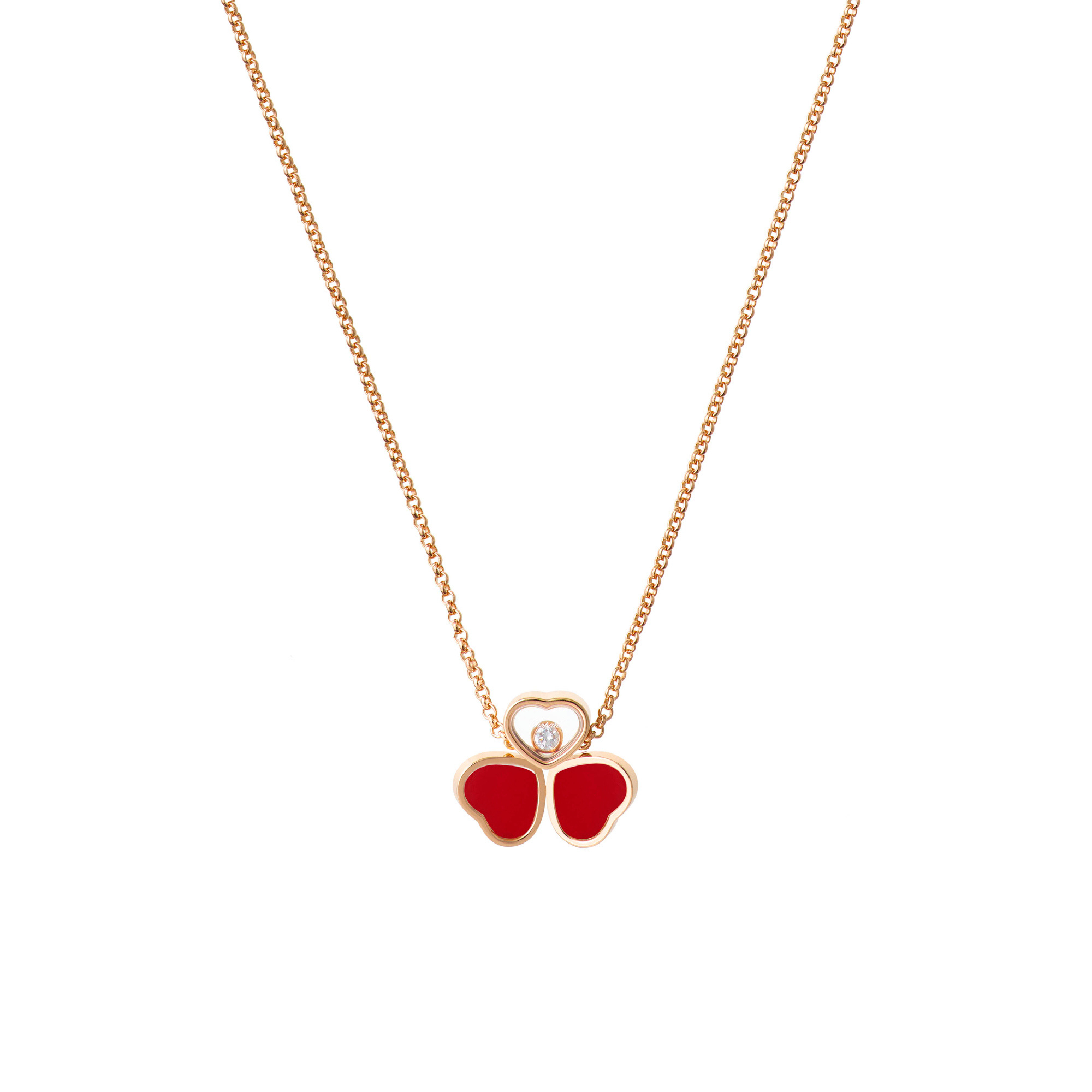 Die Chopard Happy Hearts Wings Halskette mit Anhänger (Referenznummer: 81A083-5811) ist ein elegantes Schmuckstück aus 18-karätigem Roségold, verziert mit einem Diamanten im Brillantschliff (0,05 Karat) und zwei roten Emaillen. Hier sind einige Details über diese Halskette:
