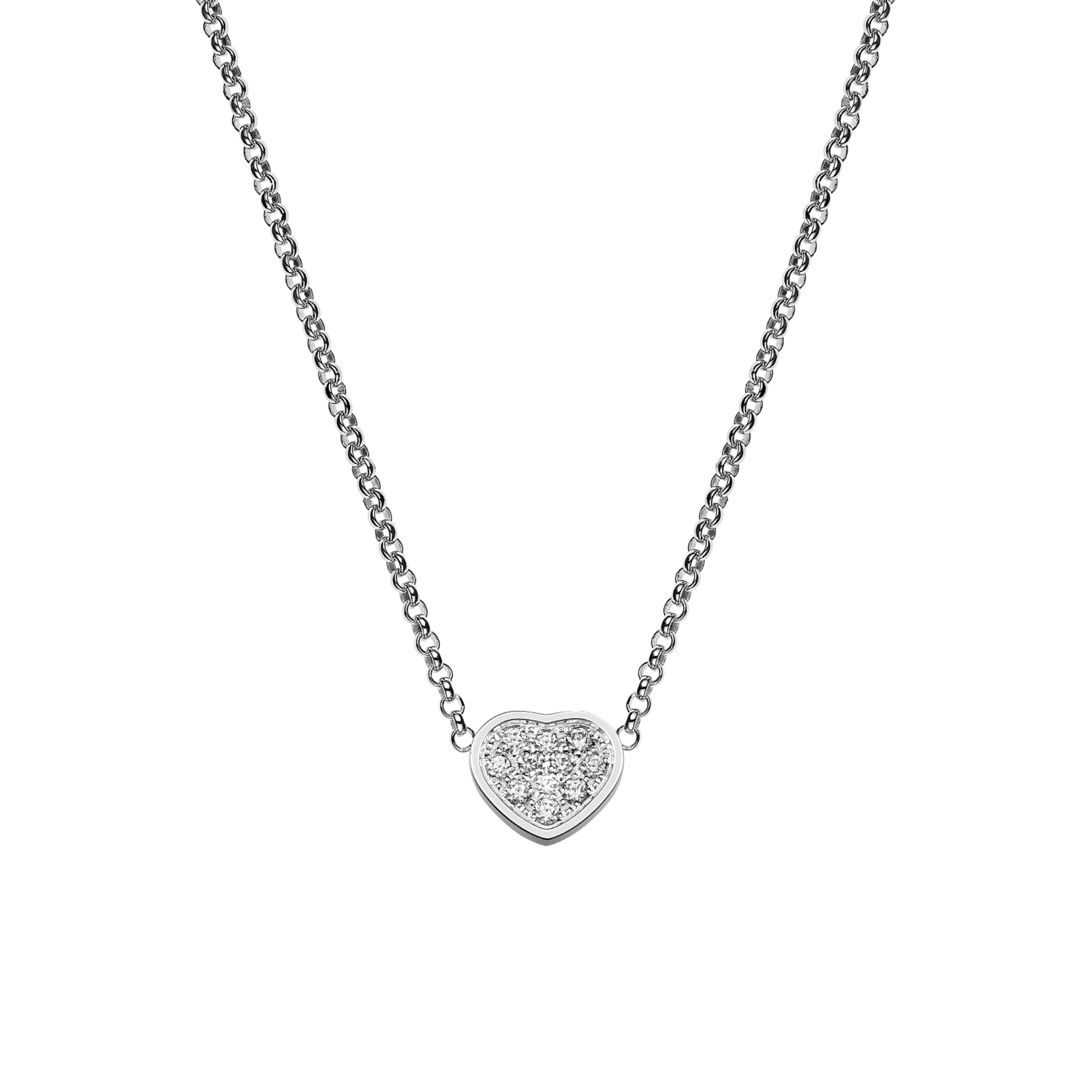 Die Chopard My Happy Hearts Halskette mit der Referenznummer 81A086-1901 ist ein elegantes Schmuckstück aus 18-karätigem Weißgold, verziert mit Diamanten. Hier sind einige Details über diese Halskette: