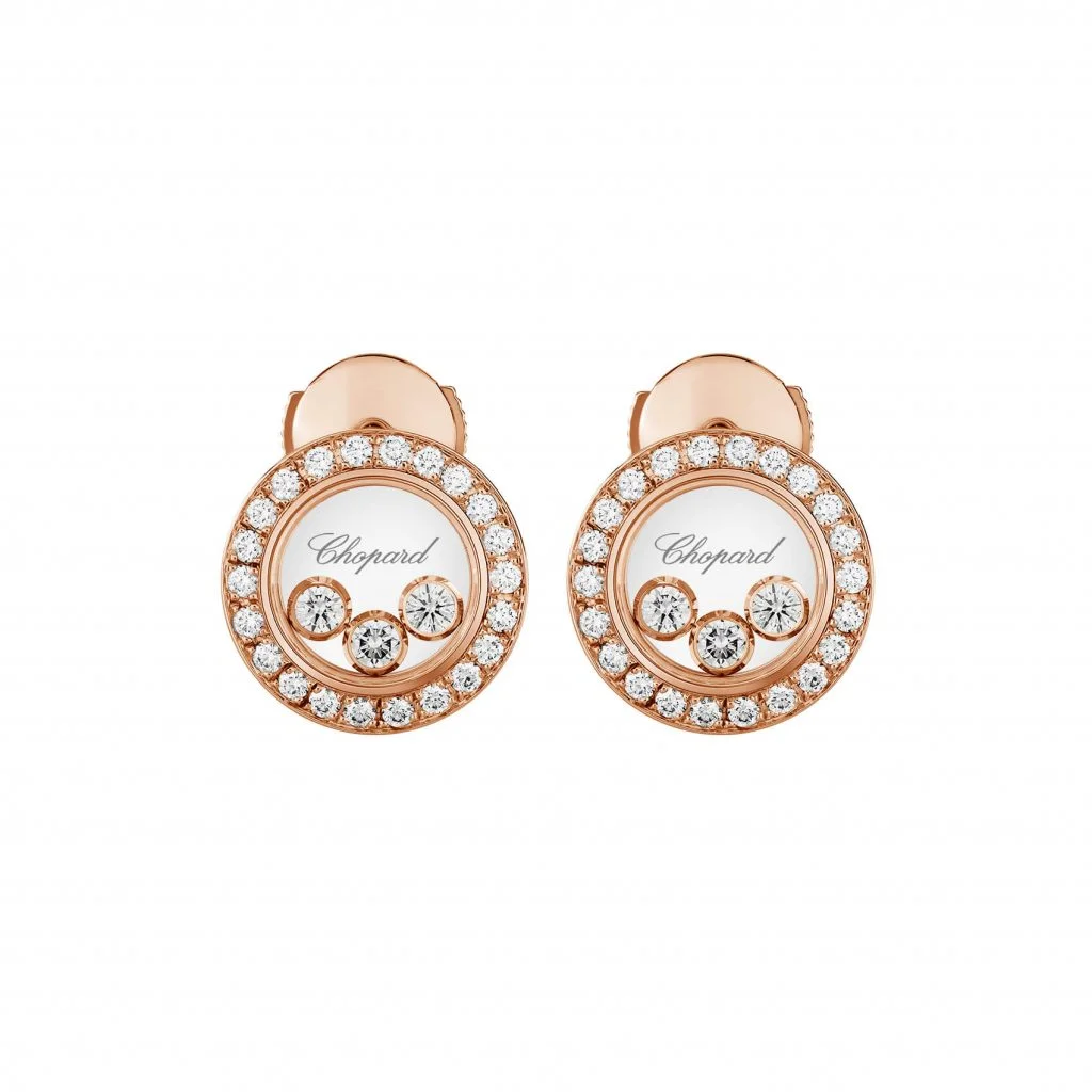 Die Chopard Happy Diamonds Icons Ohrstecker sind ein Sinnbild für moderne Weiblichkeit und luxuriöse Raffinesse. Aus 18 Karat ethischem Roségold gefertigt, fangen diese runden Schmuckstücke das Licht auf einzigartige Weise ein. Das Herzstück bildet das legendäre Konzept der tanzenden Diamanten: Drei frei bewegliche Brillanten wirbeln zwischen zwei Saphirgläsern und erzeugen bei jeder Kopfbewegung ein lebendiges Funkeln. Ein kostbarer Kranz aus Pavé-Diamanten rahmt die tanzenden Steine ein und verleiht den Ohrsteckern eine unvergleichliche Brillanz.