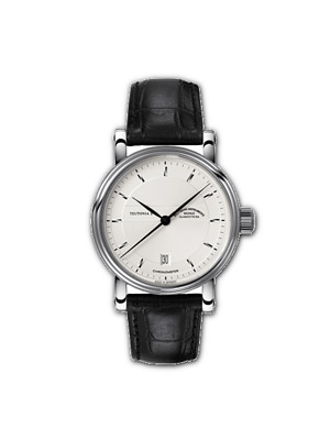 Mühle Glashütte´s Teutonia II Chronometer ist ein perfekter Zeitmesser. Diese Uhr wird strengstens von der COSC-Chronometernorm geprüft. Das klassische Desing, mit Stunden-, Minuten, und Sekundenzeiger sowie einem Datumsfenster auf 6 Uhr ist gelungen. Die 39mm große Edelstahluhr ist ein besonders Stück in der Kollektion. Das silberne Zifferblatt passt perfekt an jeden Arm. Ein schwarzes Krokolederband rundet alles ab.