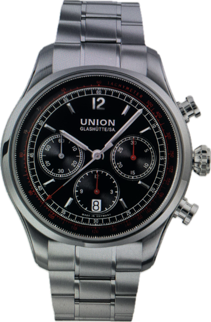 Union Belisar Chronograph Automatik, Kaliber UNG-27.01, 60 Stunden Gangreserve, Herrenchronograph mit einem Edelstahlgehäuse im Durchmesser von 44 mm, Höhe 15 mm, schwarzes Zifferblatt mit Stunden, Minuten, kleine Sekunde, Datumsanzeige im Zifferblattfenster, Chronograph 60 Sekunden, 30 Minuten und 12 Stunden Zähler, Sekundenstopp, Minuterie, Edelstahlband mit Doppelfaltschließe, beidseitig entsiegeltes Saphirglas, 10 bar wasserdicht