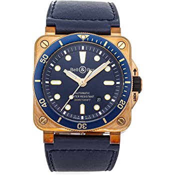 Bronzegehäuse mit blauem Lederarmband (Kalbsleder). Unidirektional drehbare Bronzelünette mit blau eloxiertem Aluminiumeinsatz. Blaues Zifferblatt mit leuchtenden roségoldfarbenen Zeigern und Punktindexen. Minutenmarkierungen am äußeren Rand. Zifferblatt-Typ: Analog. Nachleuchtende Zeiger und Markierungen. Datumsanzeige zwischen der 4- und 5-Uhr-Position. Bell and Ross Kaliber BR-CAL.302 Automatikwerk, basierend auf Sellita SW300-1, mit 25 Juwelen, einer Ganggenauigkeit von 28800 U/min und einer Gangreserve von ca. 38 Stunden. Kratzfestes Saphirglas. Verschraubte Krone. Solider Gehäuseboden. Quadratische Gehäuseform, Gehäusegröße: 42 mm. Gehäusestärke: 9,8 mm. Dornschließe. Wasserdicht bis 300 Meter. Funktionen: Datum, Stunde, Minute, Sekunde. Limitierte Auflage von 999 Stück. Hergestellt in der Schweiz. Bell and Ross Diver Automatic Blue Dial Herrenuhr BR0392-D-LU-BR/SCA