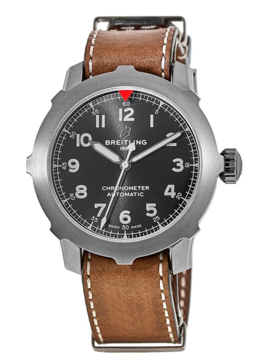 Silberfarbenes Edelstahlgehäuse mit braunem Kalbslederarmband. Bidirektional drehbare, silberfarbene Edelstahl-Lünette. Schwarzes Zifferblatt mit silberfarbenen Zeigern und arabischen Ziffern. Minutenmarkierungen um den äußeren Rand herum. Zifferblatttyp: Analog. Leuchtende Zeiger und Marker. Breitling Kaliber 20 Automatikwerk mit 70 Stunden Gangreserve. Kratzfestes Saphirglas. Krone festschrauben. Stabiler Gehäuseboden. Runde Gehäuseform, Gehäusegröße: 46 mm, Gehäusestärke: 14,40 mm. Bandbreite: 23 mm. Dornschließe. Wasserdicht bis 30 Meter / 100 Fuß. Funktionen: Stunde, Minute, Sekunde, Chronometer.