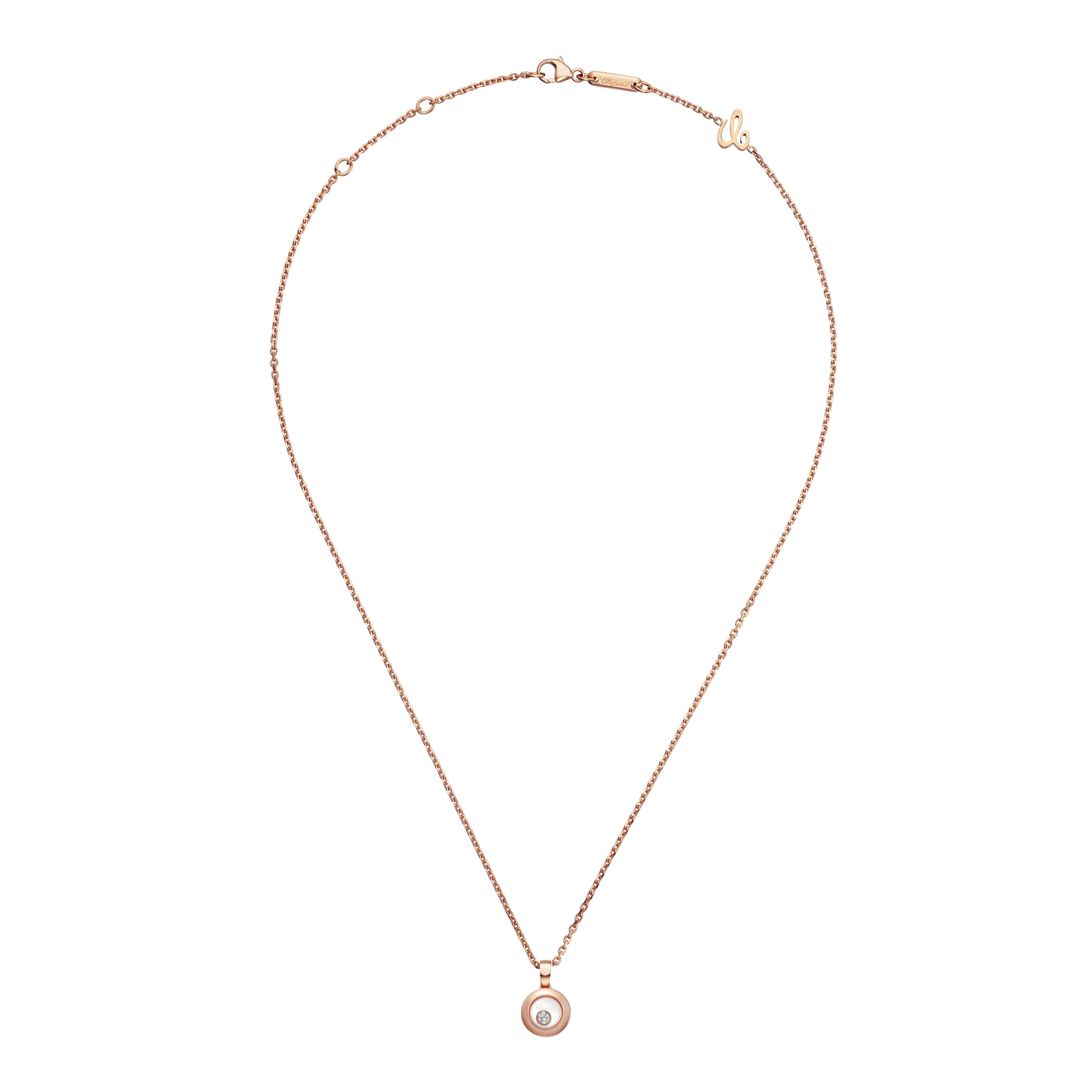 Ref. 79A017-5001 - Als Herzstück der Damenschmuckserie ist die Kollektion Happy Diamonds Icons ebenso einzigartig wie verspielt. Inspiriert von den glitzernden Tropfen eines Wasserfalls wirbelt der frei bewegliche Diamant dieses neuen runden Anhängers aus 18 Karat Roségold zwischen zwei Saphirgläsern umher und lässt eine zarte und fröhliche Kaskade des Lichts entstehen.
