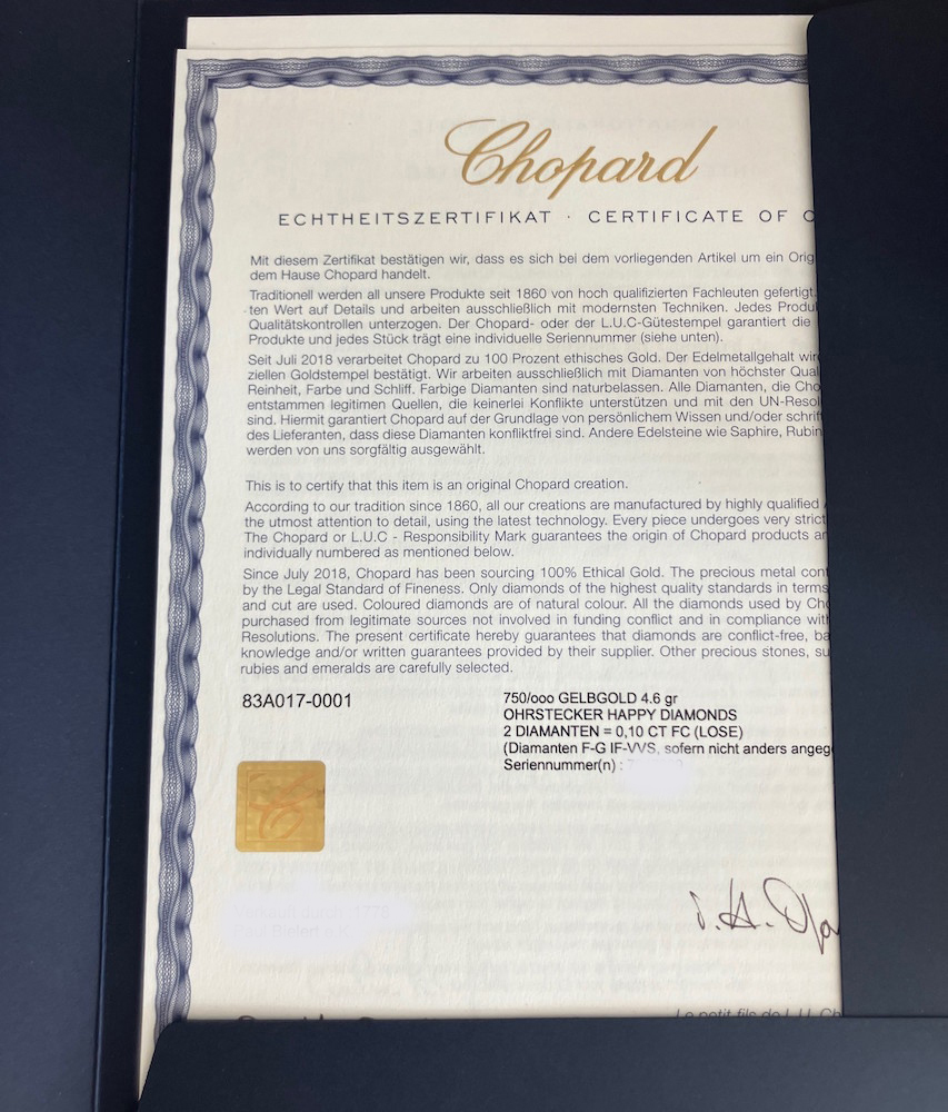 und enthält die originalen Herstellergarantieunterlagen von Chopard.