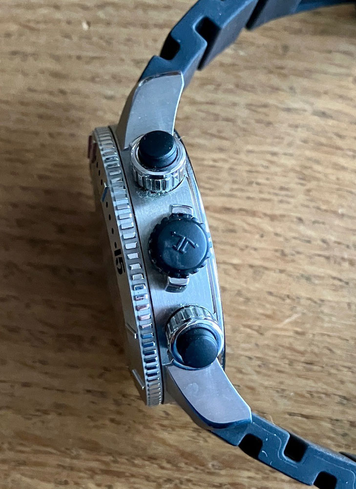 - Innovatives Compressor-System: Ein Markenzeichen dieser Linie sind die hervorragenden Compressor-Chronographendrücker und -krone. Dieses patentierte System gewährleistet nicht nur eine erhöhte Wasserdichtigkeit, sondern auch eine sichere Bedienung unter allen Umständen. Die integrierte Drehlünette ist ein essenzielles Instrument für Tauchgänge.