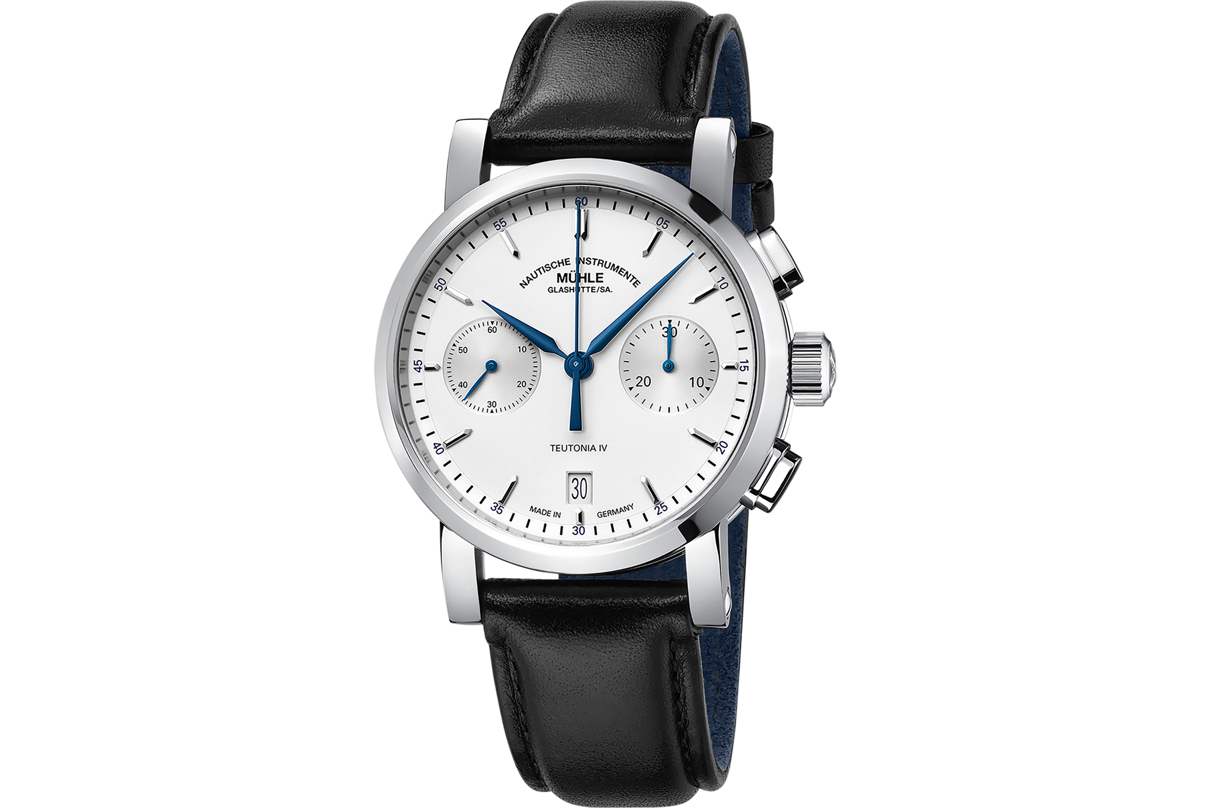 Die Teutonia IV bietet eine zentrale Stunden-, Minuten- und Sekundenanzeige sowie ein Großdatum bei 6 Uhr, das durch das eigens entwickelte Werkmodul ermöglicht wird. Die verschraubte Krone und die Wasserdichtigkeit bis 10 bar machen die Uhr zu einem zuverlässigen Begleiter im Alltag.