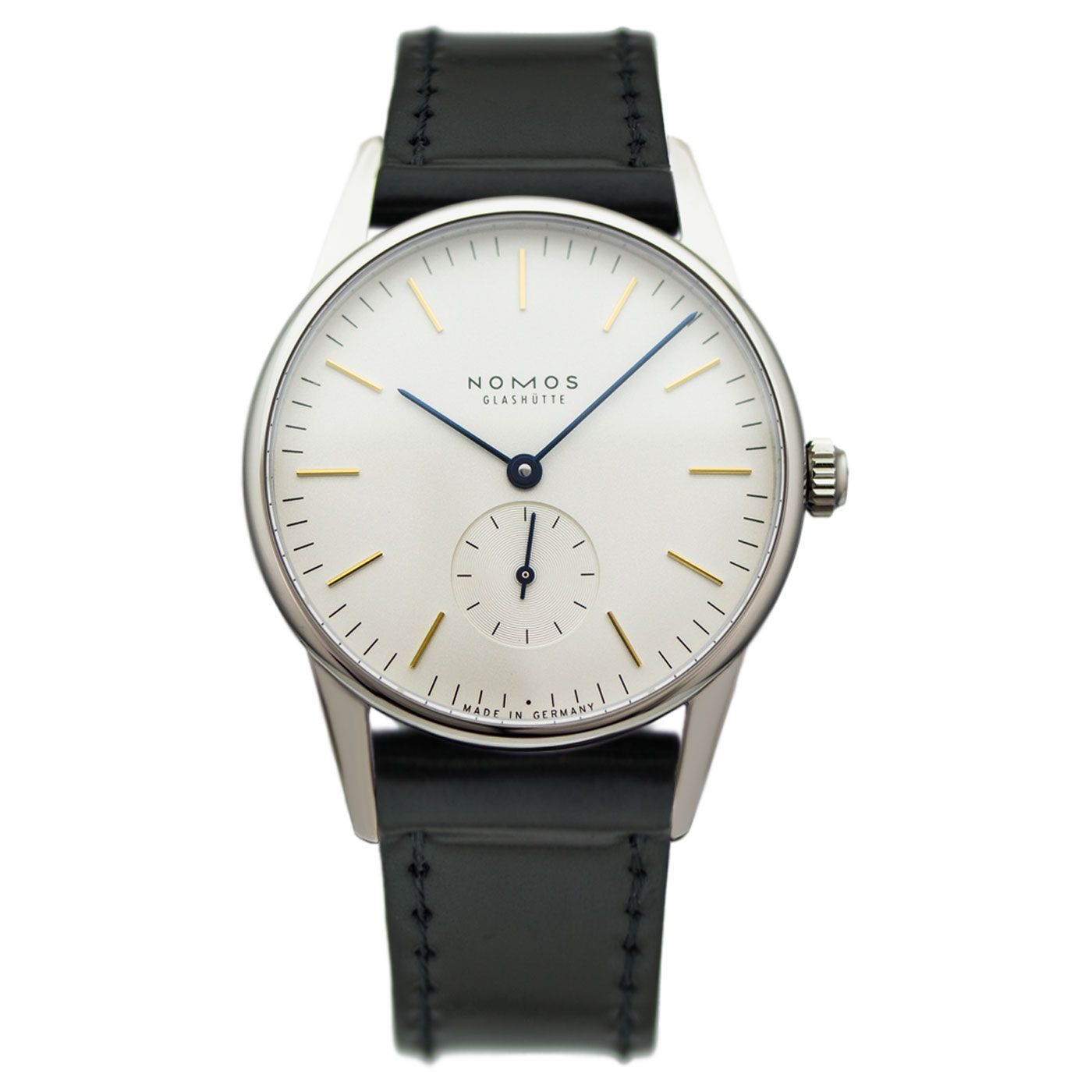 Eine Orion ist die Lieblingsuhr der zahlreichen NOMOS-Designer - schlicht und deutlich, konzentriert auf das Essenzielle, eine Ausführung in bester Werkbund- und Bauhaustradition. Mit Handaufzug, goldenen Indizes und temperaturblauen Zeigern auf einem weiß versilberten Zifferblatt ist diese Version so aktuell, dass sie Sie noch lange begleiten wird.