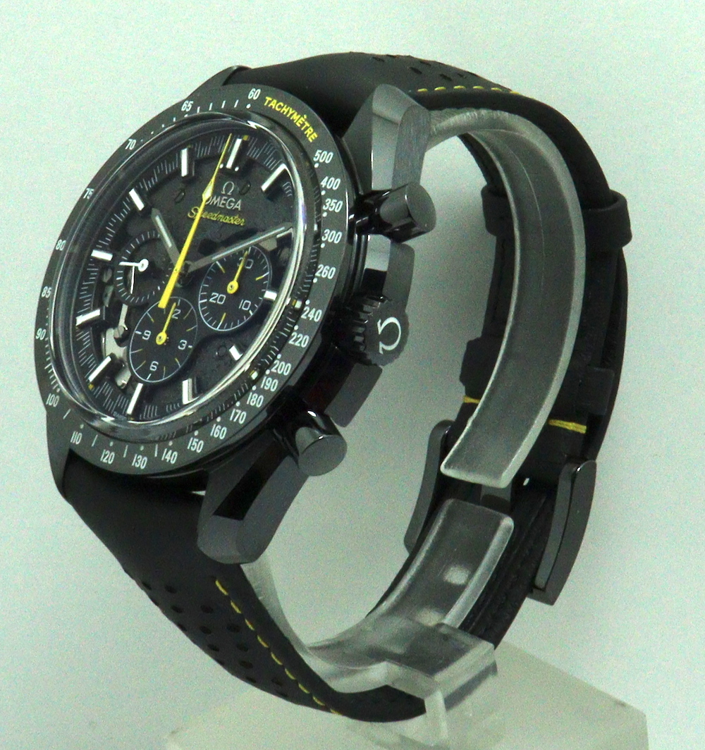 Diese Speedmaster wird von einem gelochten schwarzen Lederarmband am Handgelenk des Trägers getragen, und ihr einzigartiges Design bleibt dem Pioniergeist von Apollo 8 stets treu. Die komplette Uhr ist aus glatter schwarzer Keramik gearbeitet, und das skelettierte Zifferblatt zeigt das geschwärzte Uhrwerk von innen. Der Laser hat das Uhrwerk so bearbeitet, dass eine realistische Darstellung der Mondoberfläche entstanden ist. Die Chronographenzeiger wurden gelb lackiert, während die Tachymeterskala und die Krone der Uhr mit weißer Super-LumiNova gefüllt sind. Die Schriftzüge "Speedmaster" und "Tachymeter" sind ebenfalls in Gelb gehalten. Auf dem transparenten Gehäuseboden stehen die letzten Worte von Jim Lovell an die Bodenkontrolle, bevor Apollo 8 zur dunklen Seite des Mondes flog: "WIR SEHEN UNS AUF DER ANDEREN SEITE."