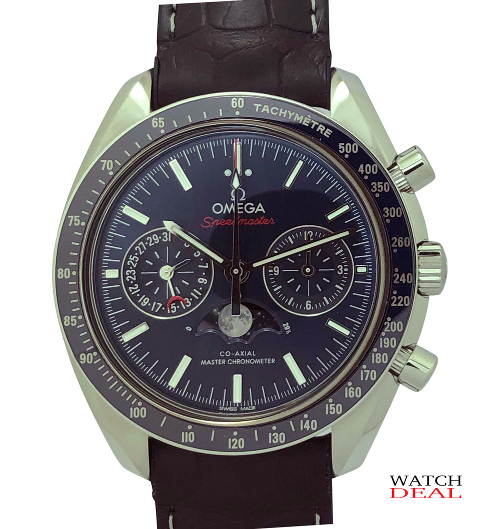 Edelstahlgehäuse mit blauem Lederarmband. Feste Edelstahl-Lünette mit blauem Keramik-Oberring mit Tachymeter-Markierungen. Blaues Zifferblatt mit leuchtenden silberfarbenen Zeigern und Index-Stundenindexen. Minutenmarkierungen um den äußeren Rand herum. Zifferblatttyp: Analog. Leuchtende Zeiger und Marker. Chronograph - zwei Unterzifferblätter mit folgenden Anzeigen: Datum / kleine Sekunde und 12 Stunde / 60 Minute. Mondphasenanzeige. Automatikwerk Omega Kaliber 9904 mit 60 Stunden Gangreserve. Kratzfestes Saphirglas. Krone festschrauben. Transparenter Gehäuseboden. Gehäusegröße: 44,25 mm. Runde Gehäuseform. Bandbreite: 231 mm. Faltschließe. Wasserdicht bis 100 Meter. Funktionen: Mondphase, Chronograph, Tachymeter, Datum, Stunde, Minute, Sekunde, Koaxialhemmung, Chronometer. Luxuriöser Uhren-Stil. Etikett ansehen: Swiss Made. Omega Speedmaster Automatische Herrenuhr 304.33.44.52.03.03.001.