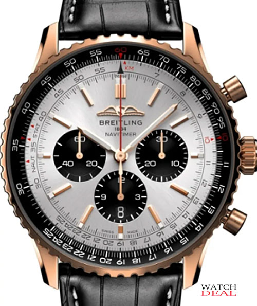 Breitling Navitimer 1 B01 Chronograph 46. Wird mit einem polierten 18kt Rotgoldgehäuse und schwarzem Lederarmband geliefert. Die bidirektionale drehbare Lünette hat einen kreisförmigen Rechenschieber für die Luftfahrt. Die Index-Stundenmarkierungen sowie die zentralen Stunden- und Minutenzeiger leuchten. Der Zifferblatttyp ist analog. Die Zifferblattfarbe ist grau mit schwarzen Subzifferblättern. Das Datum wird zwischen 4 und 5 Uhr angezeigt. Der Chronograph verfügt über einen großen roten Zentralsekundenzeiger, einen 30-Minuten-Zähler-Subdial bei der 3-Uhr-Position und einen 12-Stunden-Zähler-Subdial bei der 6-Uhr-Position. Die kleine Sekunde befindet sich bei 9 Uhr. Das automatische Chronometer-Uhrwerk mit Automatikaufzug Breitling Caliber 01 ist mit einer Gangreserve von 70 Stunden, 28.800 V/h und 47 Steinen ausgestattet. Ein gewölbtes, kratzfestes Saphirglas, das auf beiden Seiten entspiegelt ist, schützt das Zifferblatt. Das Gehäuse ist rund, 46mm im Durchmesser, wiegt 80,80g und ist 13,9mm dick. Einlassbreite: 22 mm. Verschraubter Saphirglas-Ausstellungsboden. Faltschließe aus Edelstahl. Wasserdicht bis 30 Meter / 100 Fuß. Funktionen: Stunden, Minuten, kleine Sekunden, Datum, Chronograph, Rechenschieber.