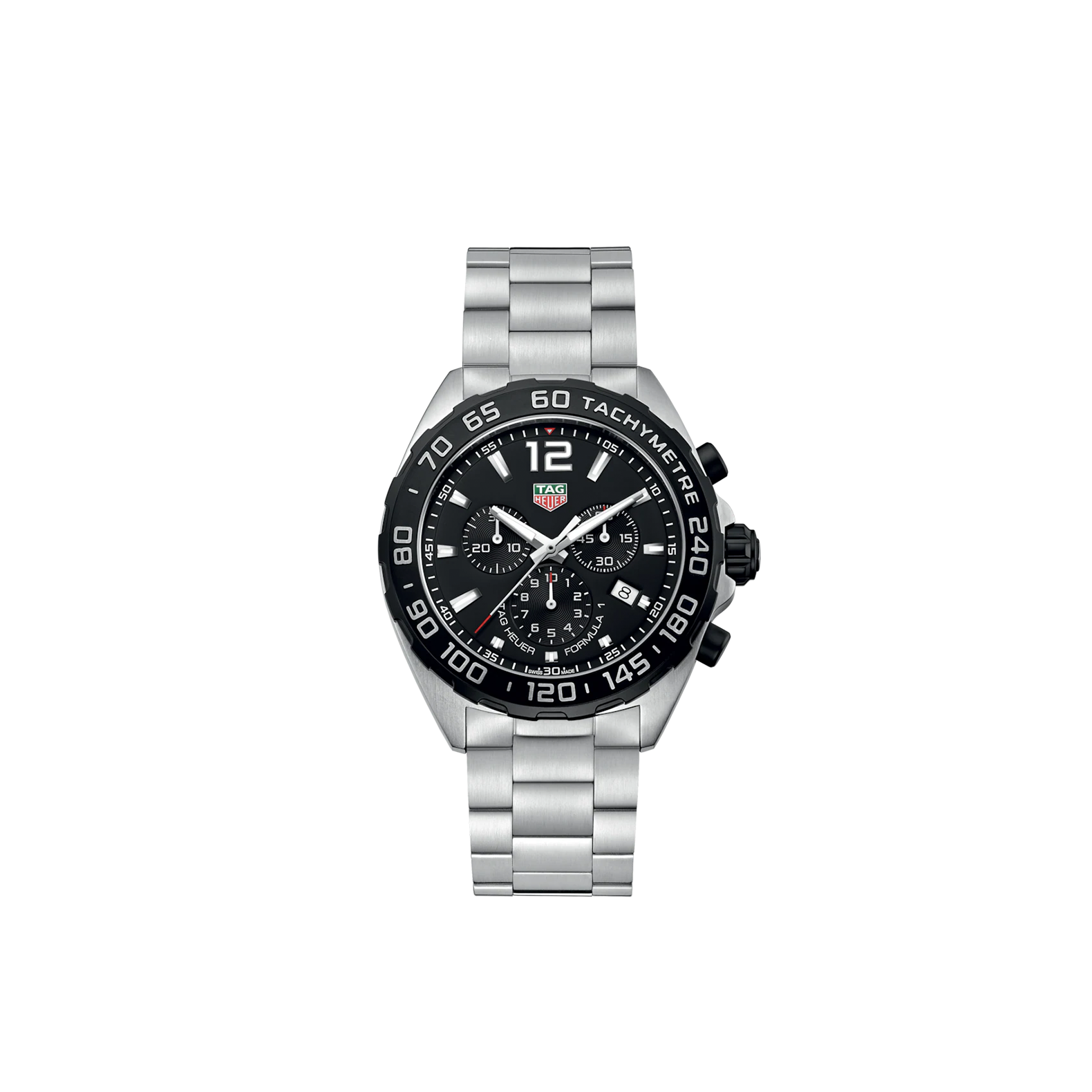 Silberfarbenes Edelstahlgehäuse mit einem silberfarbenen Edelstahlarmband. Feste Lünette aus schwarzem, karbidbeschichtetem Titan. Schwarzes Zifferblatt mit silberfarbenen Leuchtzeigern und Index-Stundenmarkierungen. Arabische Ziffern an den 12-Uhr-Positionen. Minutenmarkierungen am äußeren Rand. Zifferblatt Typ: Analog. Lumineszierende Zeiger und Markierungen. Datumsanzeige bei der 4-Uhr-Position. Chronograph - Unterzifferblätter mit folgenden Anzeigen: drei - 60 Sekunden, 30 Minuten und 1/10-Sekunde. Quarz-Uhrwerk. Kratzfestes Saphirglas. Verschraubte Krone. Massiver Gehäuseboden. Runde Gehäuseform, Gehäusegröße: 43 mm, Gehäusedicke: 16 mm. Bandbreite: 20 mm, Bandlänge: 9 Zoll. Faltschließe. Wasserdicht bis 200 Meter. Funktionen: Chronograph, Datum, Stunde, Minute, Sekunde, Tachymeter. Tag Heuer Formel 1 Chronograph schwarzes Zifferblatt Herrenuhr CAZ1010.BA0842