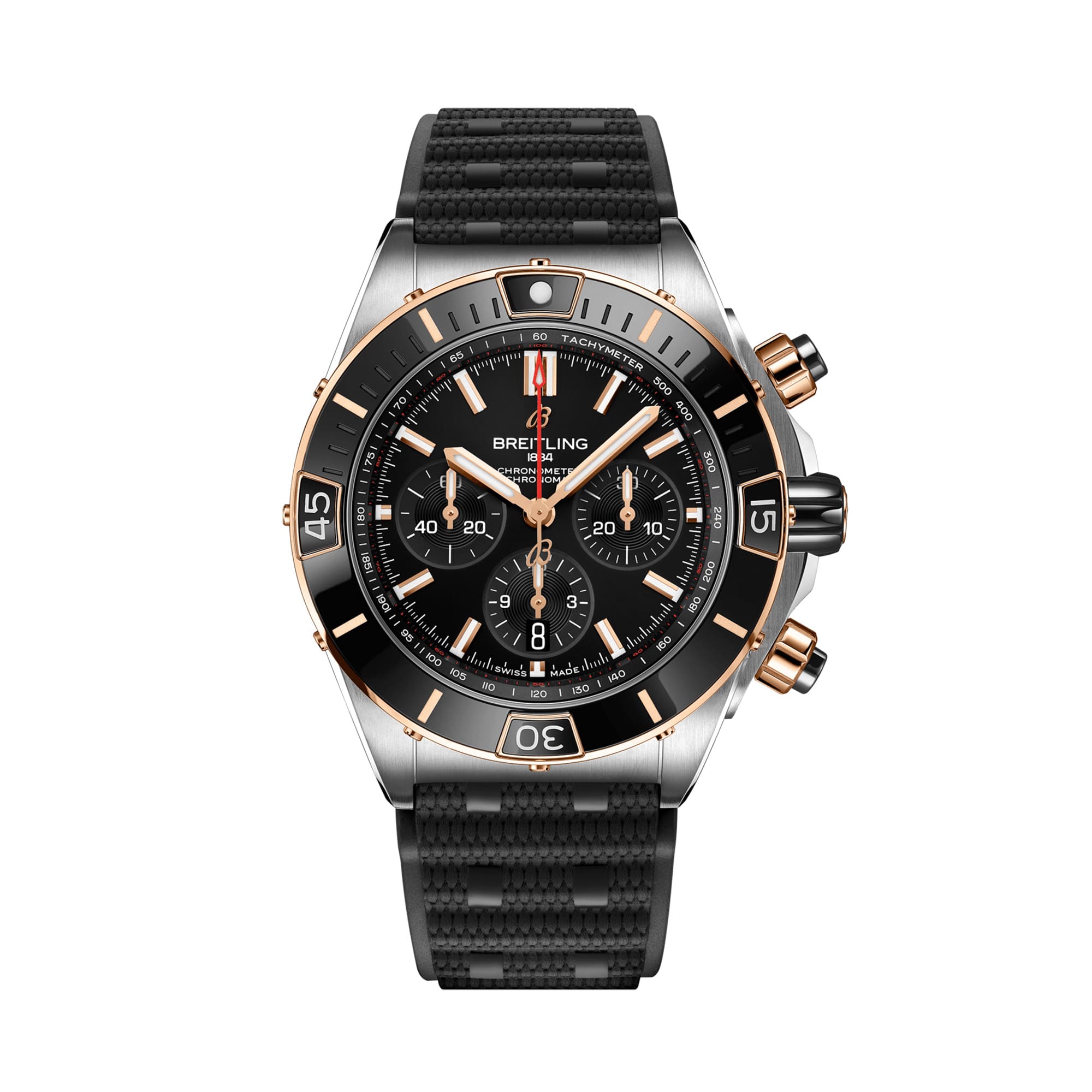 Die leistungsstarke Breitling Uhr für alle Gelegenheiten. Die Super Chronomat wurde von der Original-Chronomat aus den 1980er-Jahren inspiriert, die von Breitling für die tollkühnen Piloten von Kunstflugstaffeln entwickelt wurde. Als wohl auffallendstes Modell dieser Kollektion besticht die Super Chronomat durch mehrere Keramikeinsätze – auf der Lünette, den Chronographendrückern und der Krone – und durch ein Kautschukarmband in Rouleaux-Optik. Bei aller Sportlichkeit steht diese Allzweckuhr Ihrem Sinn für Stil aber nicht im Weg. Die Super Chronomat ist in verschiedenen Farb- und Metallvarianten erhältlich, von Edelstahl bis hin zu 18-karätigem Rotgold. Ergänzt wird sie durch das unverwechselbare Rouleaux-Armband oder durch ein Kautschukarmband in der gleichen Optik, jeweils mit passender Faltschliesse. Die Super Chronomat B01 44 wird von einem Breitling-Manufakturkaliber 01, einem COSC-zertifizierten Chronometer, angetrieben.