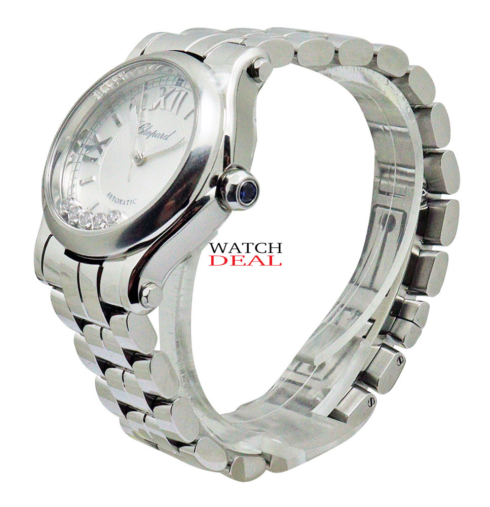 The Happy Sport 30 mm automatic watch sparkles with feminine flair. The magnificent handcrafted stainless steel watch with polished bezel and metal bracelet creates the stylish aesthetics that Chopard represents. The silver dial skilfully highlights the Roman numerals and rhodium-plated hands, while five of Chopard's famous moving diamonds swirl around in a fascinating play of light.