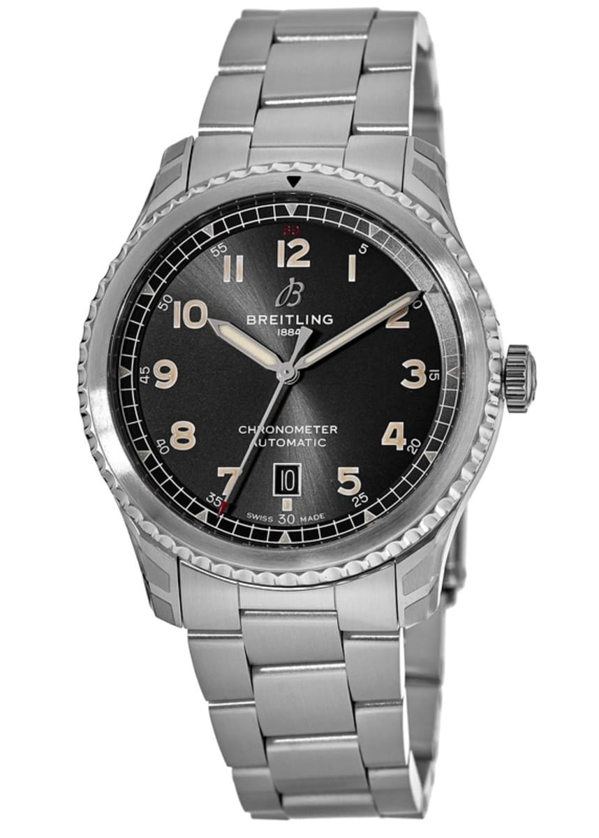 Stainless steel case with a stainless steel bracelet. Bi-directional rotating stainless steel bezel. Black dial with luminous silver-tone hands and Arabic numeral hour markers. Minute markers around the outer rim. Dial Type: Analog. Luminescent hands and markers. Date display at the 6 o'clock position. Breitling calibre 17 automatic movement with a 38-hour power reserve. Scratch resistant sapphire crystal. Screw locked crown. Solid case back. Round case shape. Case size: 41 mm. Case thickness: 10.74 mm. Band width: 21 mm. Deployment clasp with a push button release. Water resistant at 100 meters. Functions: date, hour, minute, second, chronometer. Luxury watch style. Swiss Made. Breitling Avaitor 8 Automatic Chronometer