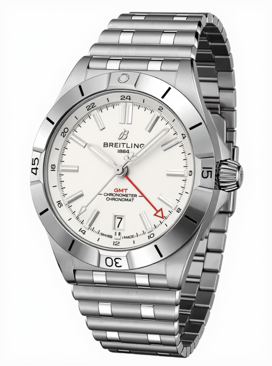 The Chronomat Automatic GMT 40 is Breitling's nod to world travel - not only thanks to its dial, which displays two time zones, but also to its casual aesthetic. The subtle interplay of dials and stainless steel cases and bracelets goes well with any wardrobe. At the same time, the tone-on-tone 24-hour scale highlights the red GMT hand. Powered by Breitling's caliber 32, the GMT complication allows the user to follow a second time zone thanks to the 24-hour scale and know instantly whether it's day or night there, while the "onion crown" (a classic Chronomat feature that owes its name to the fluted dome shape) allows for easy adjustments. An all-purpose sports watch, the GMT 40 is at home in all of Breitling's universes - land, sea, and air - and scores with impressive water resistance to 200 meters. The Chronomat's mission to be "a watch for all purposes" is now more of a reality than ever, thanks to the GMT 40's practical size and understated style. Robust enough for the gym, yet with the elegance needed for evening wear - if ever there was a watch for traveling, this is it.