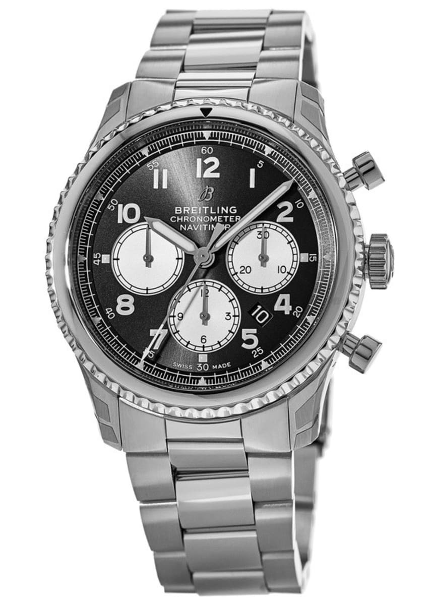 Breitling Navitimer 8 B01 Chronograph 43 AB0117131B1A1 Mens Watch. Features a brushed with polished stainless steel case and brushed with polished stainless steel Professional III bracelet. Bezel type: Bidirectional rotating. The arabic numeral hour markers and central hour and minute hands are luminescent. Dial type is analog. Dial color is black with silver sub-dials. The date is displayed between 4 and 5 o'clock. The chronograph features a large central seconds hand, a 30 minute counter sub-dial at the 3 o'clock position and a 12 hour counter sub-dial at the 6 o'clock position. Powered by the Breitling Caliber 01 self-winding automatic chronometer certified movement which boasts a 70 hour power reserve, beats at 28,800 vph and contains 47 jewels. Has a scratch resistant sapphire crystal protecting the dial and a see-through sapphire crystal case back. The case is round, 43mm in diameter and is 13.97mm thick. The crown is screw-locked and the case back is screwed in. Inlet width: 23 mm. Stainless steel deployment buckle. Water-Resistant to 100 meters / 330 feet. Functions: hours, minutes, small seconds, date, chronograph.