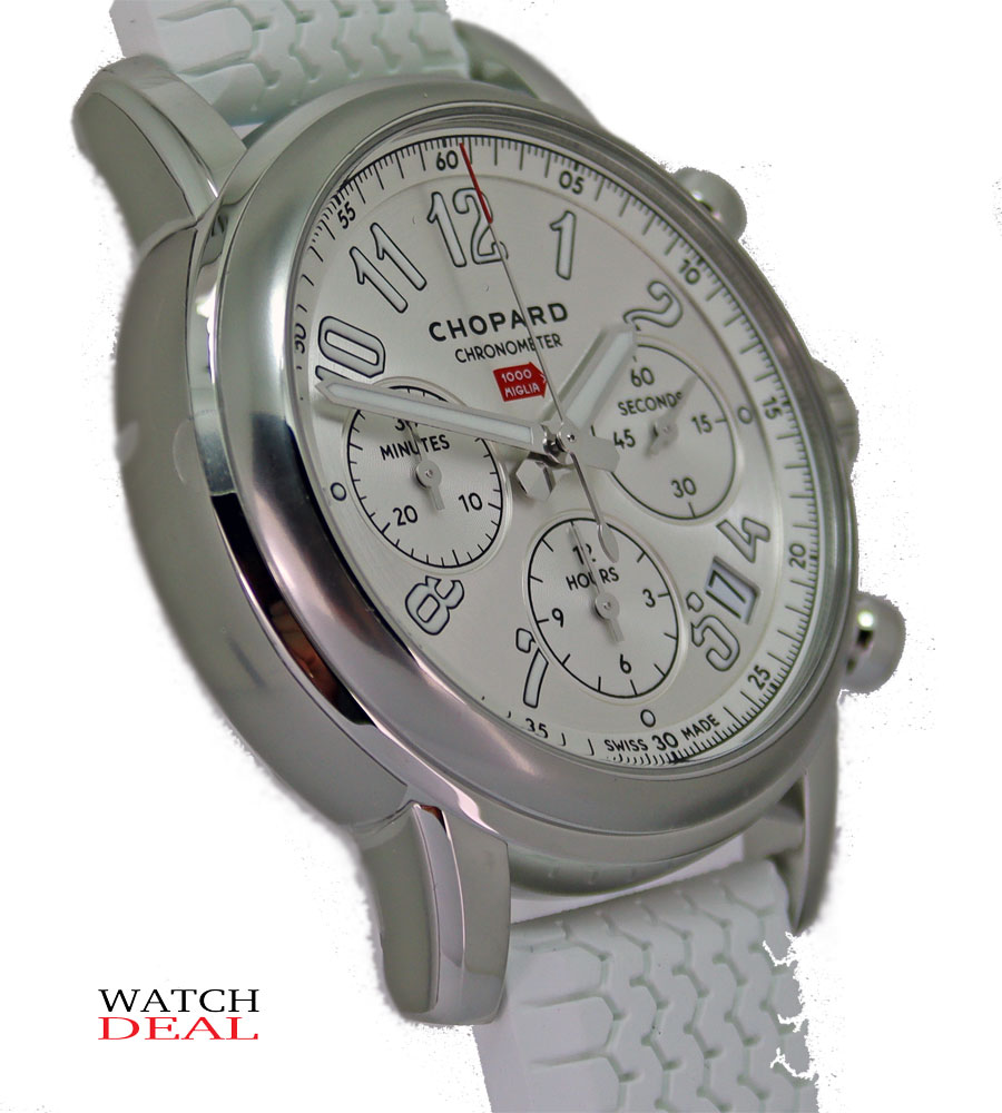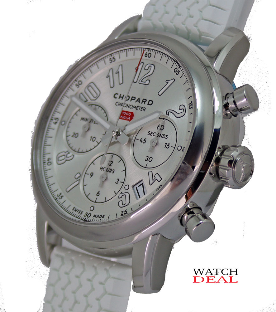 Chopard Mille Miglia Classic Chronograph 168588-3001 men's watch. Features a polished stainless steel case and white rubber strap with tire profile. Polished stainless steel fixed bezel. Silver dial with luminescent hour hand, minute hand and Arabic numeral hour markers. Date displayed in window between 4 and 5 o'clock. Chronograph with large central chronograph seconds hand, 30 minute counter sub-dial at 9 o'clock and 12 hour counter at 6 o'clock. Small seconds sub-dial at 3 o'clock. Powered by a self-winding automatic COSC Chronometer certified movement which beats at 28,800 vph and contains 37 jewels. A scratch resistant sapphire crystal protects the dial. The case is round and 39mm in diameter. Sapphire crystal exhibition case back. Screw down crown. Stainless steel tang buckle. Water resistant to 50 meters / 165 feet. Functions: hours, minutes, small seconds, date, chronograph. Sport watch style. Swiss made.