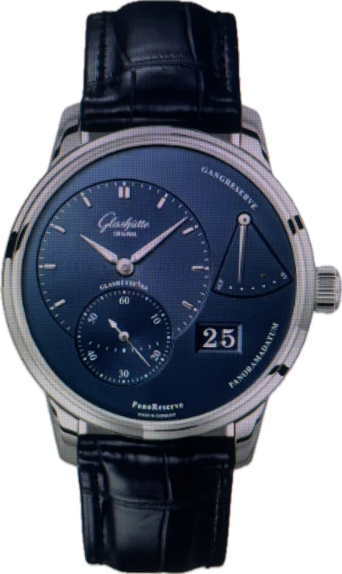 Ref. 1-65-01-26-12-61 - The PanoReserve embodies a stylish interpretation of the typical asymmetrical design of the Pano dial: with an off-center hour and minute display, a small second, the characteristic Glashütte Original Panorama Date and a power reserve display. - The elegant power reserve indicator on the right-hand side shows how much energy is still available. If the small hand is on the “OPEN” mark, the watch is fully wound. The more this hand moves in the “DOWN” direction, the more the movement has run down.