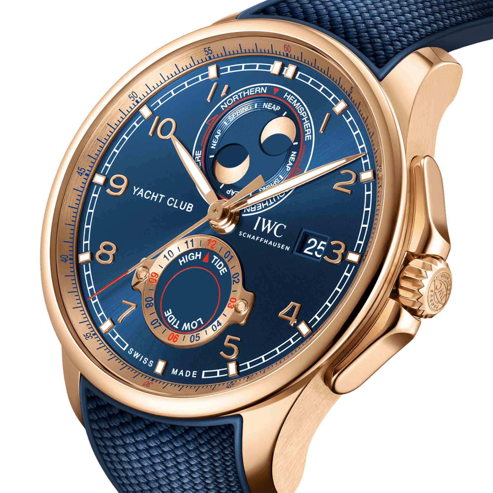 At the heart of this watch lies the advanced IWC manufacture calibre 82835. This automatic movement with Pellaton winding guarantees an impressive 60-hour power reserve and can be admired through the sapphire glass case back. The standout feature is the mechanical tide indication, which precisely displays not only the next high and low water phases but also the strength of the tides – whether spring or neap tide. A classic double moon phase display for the northern and southern hemispheres completes the nautical functions.
