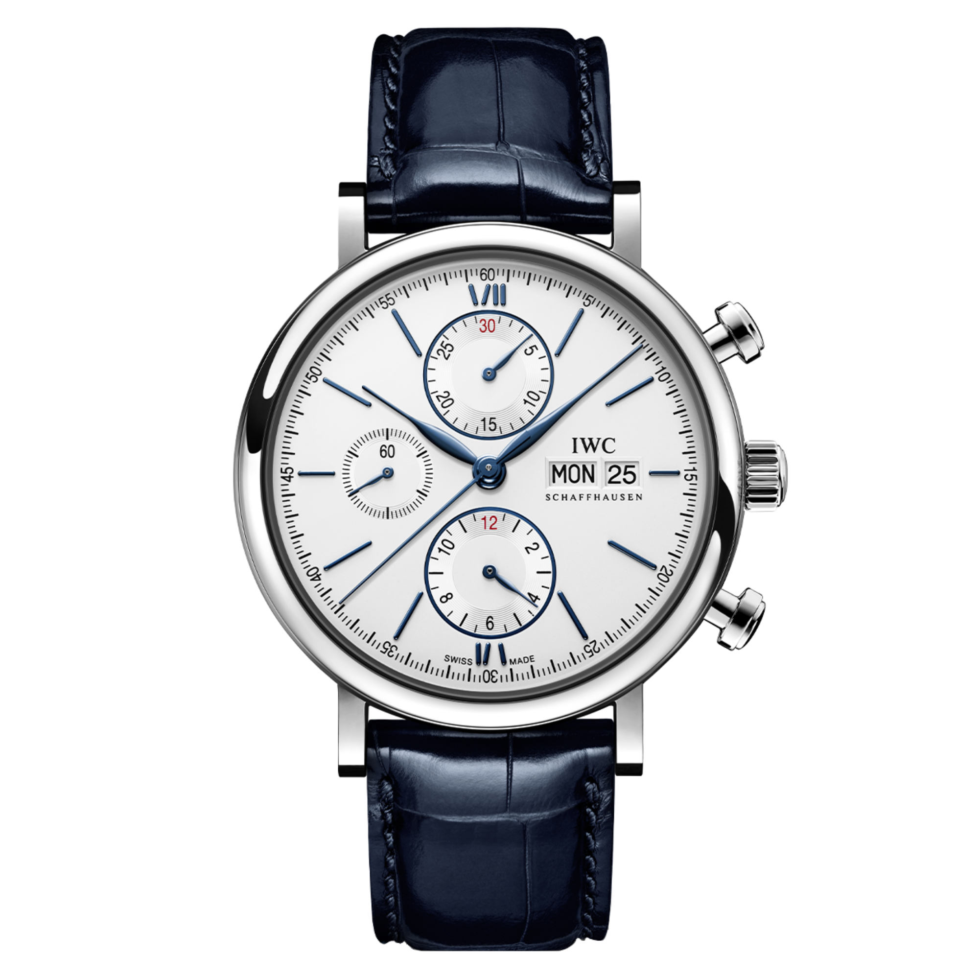 Ref. IW391037 - The first Portofino with a stopwatch function was introduced in 1988. Since then, chronographs have been an integral part of this line, which has won a loyal, worldwide following thanks to its minimalist, classically elegant design. The Portofino Chronograph is recognizable by its characteristic dial with partially recessed subdials. The minute counter is located at 12 o'clock, the hour counter at 6 o'clock, and the small seconds at 9 o'clock. A day-of-the-week and date display at 3 o'clock completes the balanced dial design. This model features a stainless steel case and a silver-plated dial. The 42-millimeter diameter ensures a visible and striking presence on the wrist. The blue appliques and hands are complemented by a blue strap made of fine alligator leather.