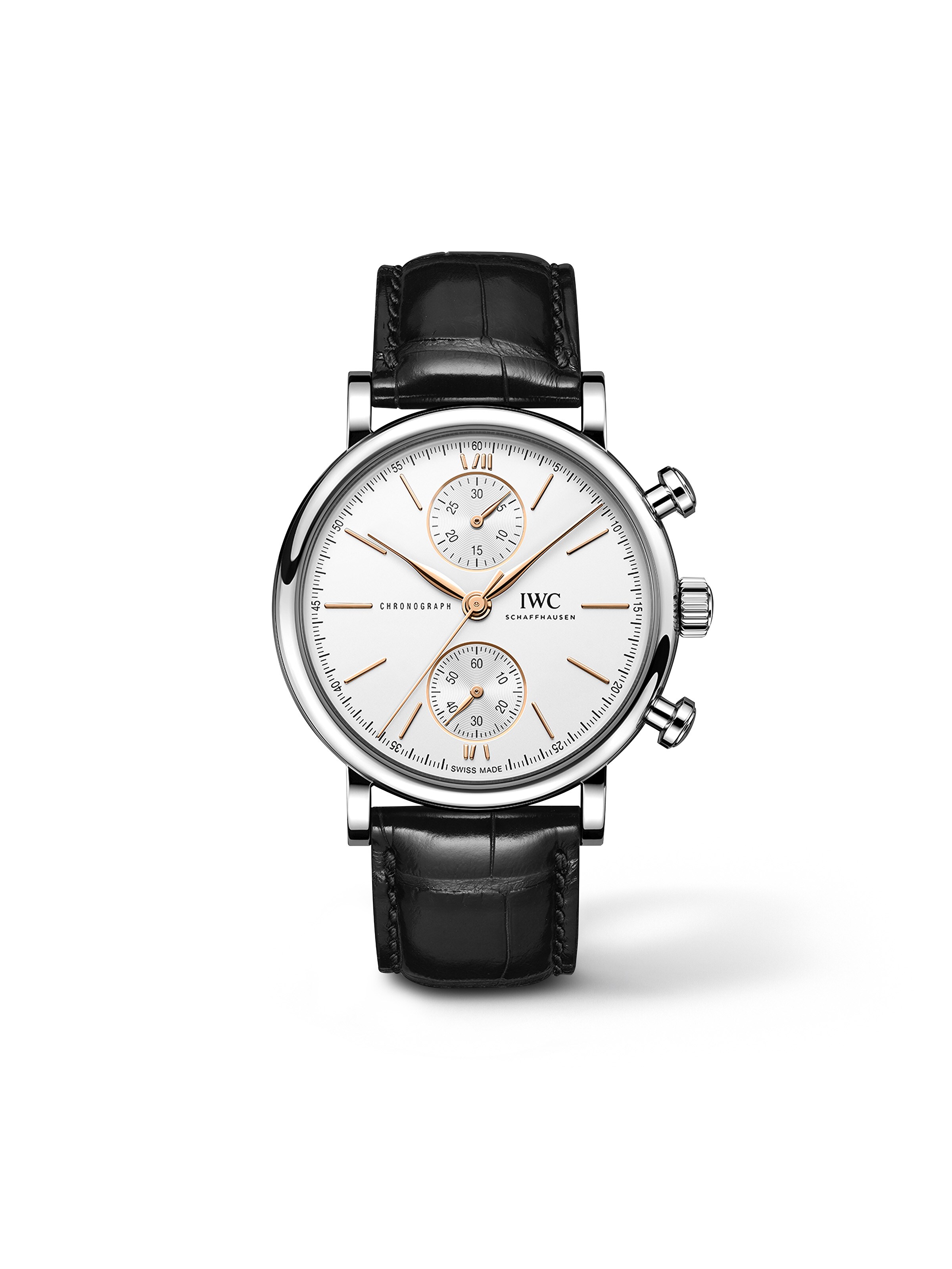 Ref. IW391406 - The Portofino family was introduced in 1984 and has since established itself as one of IWC Schaffhausen's most popular collections. The secret to its enduring success lies in its understated, classically elegant design. This is evident in the minimalist round case with straight lugs, the applied indices and Roman numerals, and the slender feuille hands. Chronographs have been a mainstay of the collection for many years, lending it a subtle, sporty touch. The Portofino Chronograph 39 impresses with a slightly more compact case diameter of 39 millimeters and the characteristic pushers. This model features a stainless steel case and a silver-plated dial.