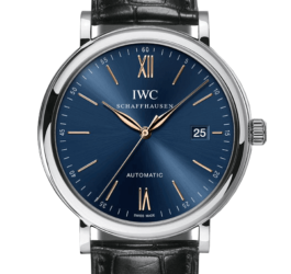 Stainless steel case with a black crocodile leather strap. Fixed stainless steel bezel. Blue dial with index hour markers. Roman numerals mark the 6 and 12 o'clock positions. minute markers around the outer rim. Dial Type: Analog. Date display at the 3 o'clock position. IWC Calibre 35111 automatic movement with a 42-hour power reserve. Scratch resistant sapphire crystal. Pull / push crown. Solid case back. Round case shape, case size: 40 mm, case thickness: 9.2. Band width: 20 mm, band length: 8 inches. Tang clasp. Water resistant at 30 meters. Functions: date, hour, minute, second.