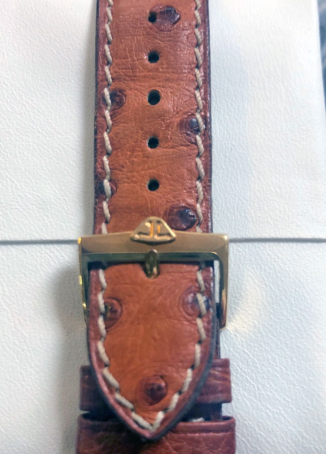 Fine unisex wristwatch in 18-carat yellow gold on an ostrich leather strap.
