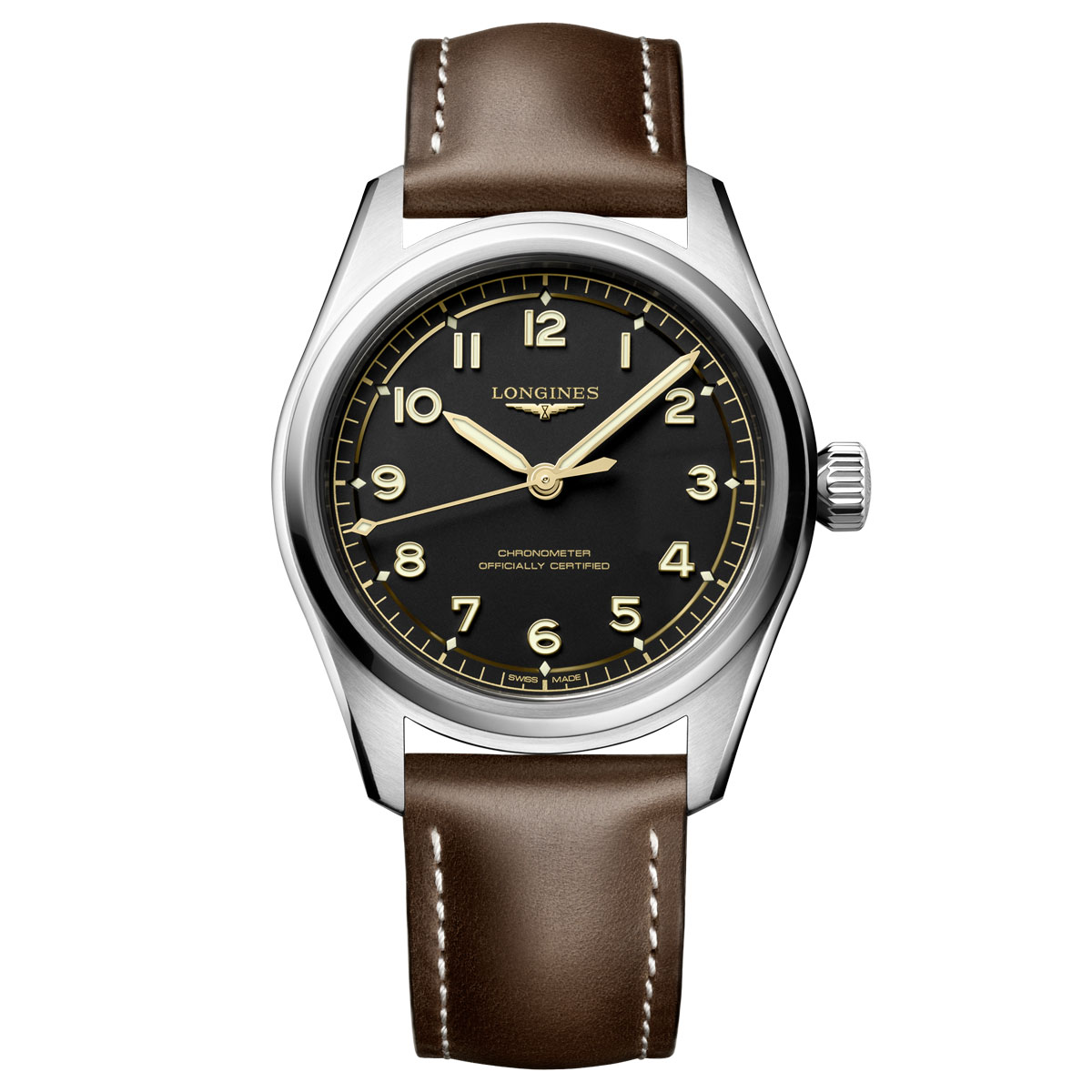 This Longines Spirit Pilot men's watch is a COSC-certified chronometer with a precise Swiss automatic movement featuring a silicon balance spring and a 72-hour power reserve. The 39mm Longines men's watch has a black dial and a stainless steel bracelet.