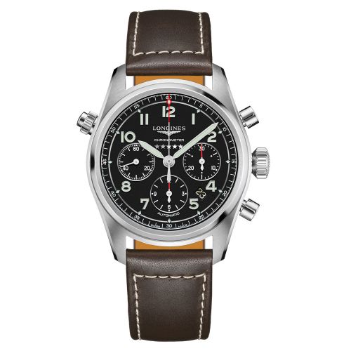 This Longines Spirit Chronograph features a precise automatic movement with silicon balance spring and 66-hour power reserve. The chronograph has a stainless steel case with a diameter of 42 mm, a black dial, and a brown leather strap. The Longines Spirit Chronometers pay homage to the pioneers of the air, sea, and land and are COSC-certified thanks to state-of-the-art Swiss watchmaking technology.