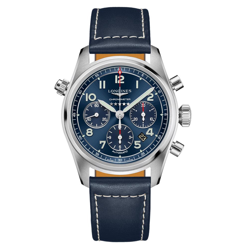 Longines Spirit Chronograph Automatic Chronometer 42 mm with blue dial & leather strap L3.820.4.93.0