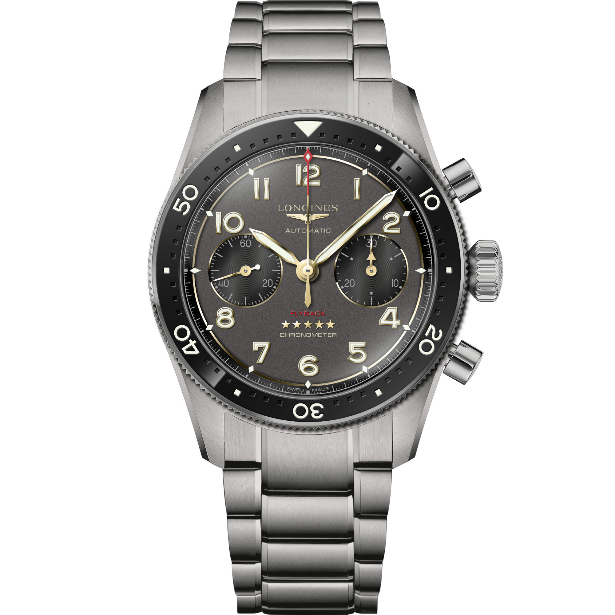 The Longines Spirit Flyback Titanium watch impresses with its inner and outer values. The chronograph features a new Longines caliber certified by COSC as a highly accurate chronometer with a magnet-resistant silicon spring and 68-hour power reserve. This sporty Longines men's watch has a 42 mm diameter titanium case with a sapphire crystal back and a titanium bracelet, making this robust watch weigh only 124.7 grams. It has a black bezel with a ceramic insert and an anthracite-colored, almost black dial.