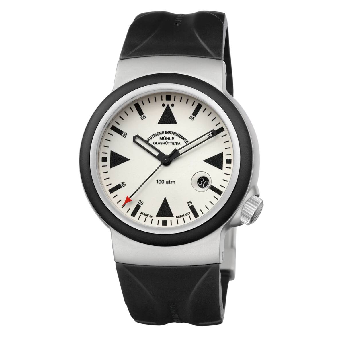 The 42 mm stainless steel case is pressure-resistant to 100 bar, making it suitable for professional diving operations. A softly rounded rubber bezel not only protects the watch from impacts but also minimizes the risk of injury to those assisting in rescue situations. The 4 mm thick, double-sided anti-reflective sapphire crystal is three times more resistant than standard glass and guarantees clear visibility even in direct sunlight.