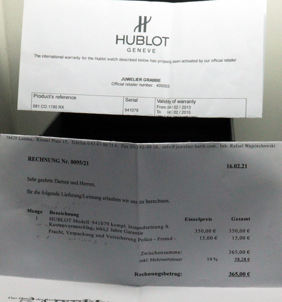 Included: watch, box, warranty card, outer box, revision invoice, invoice Hublot.