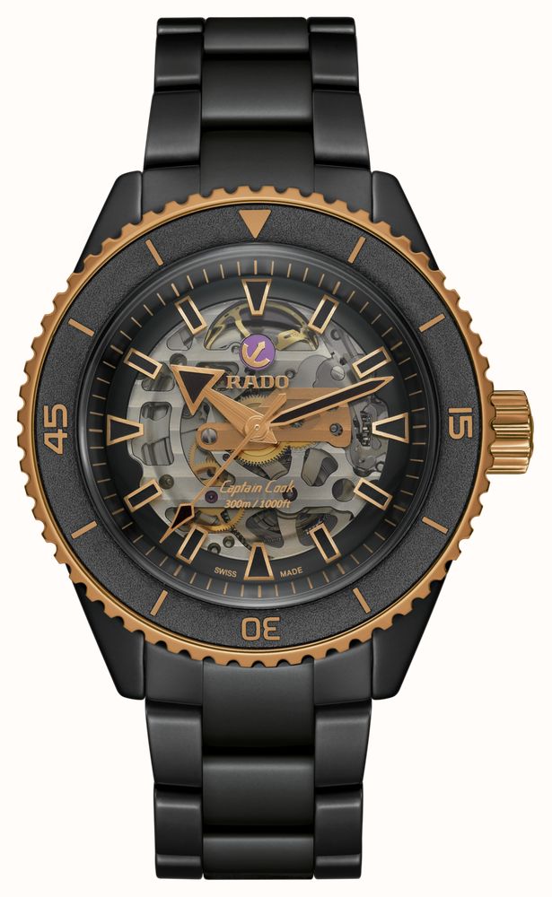 The Captain Cook High-Tech Ceramic Skeleton showcases its innovative R808 movement – a marvel of contrasts, expertise, and intelligent geometry that offers a clear view of its various components. The watch features an antimagnetic and highly reliable Nivachron™ balance spring, tested in five positions, providing a power reserve of up to 80 hours. Its elegant monobloc case, crafted from high-tech ceramic in matte black, is complemented by a rose gold-tone rotating bezel with a laser-cut black ceramic insert – a perfect color match and visually harmonious integration with the case and lugs. The dial is clean and minimalist, featuring striking geometric indices and rose gold-tone hands coated with black Super-LumiNova® for excellent legibility even in low light. Thanks to its color-coordinated, three-row bracelet made of black high-tech ceramic with a triple titanium clasp, the new Captain Cook is a faithful companion even when you venture into somewhat rugged and demanding terrain on your explorations.